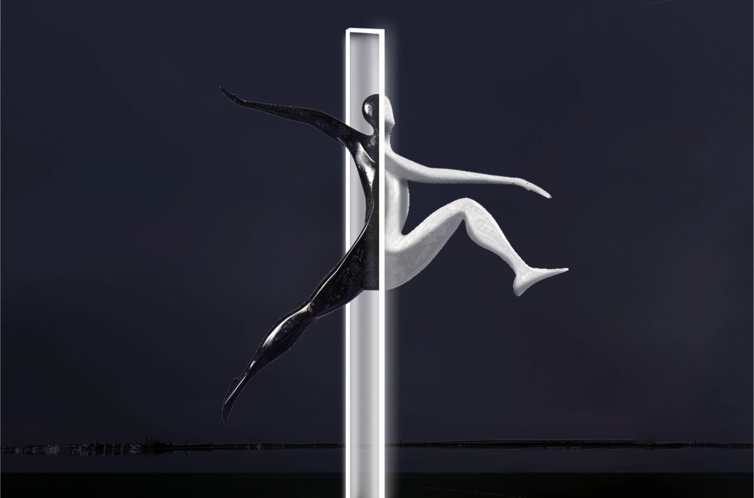 An anthropomorphic statue with abstract, yet human features fearlessly leaps through a portal of light; symbolising the passage between the past and whatever lies ahead.